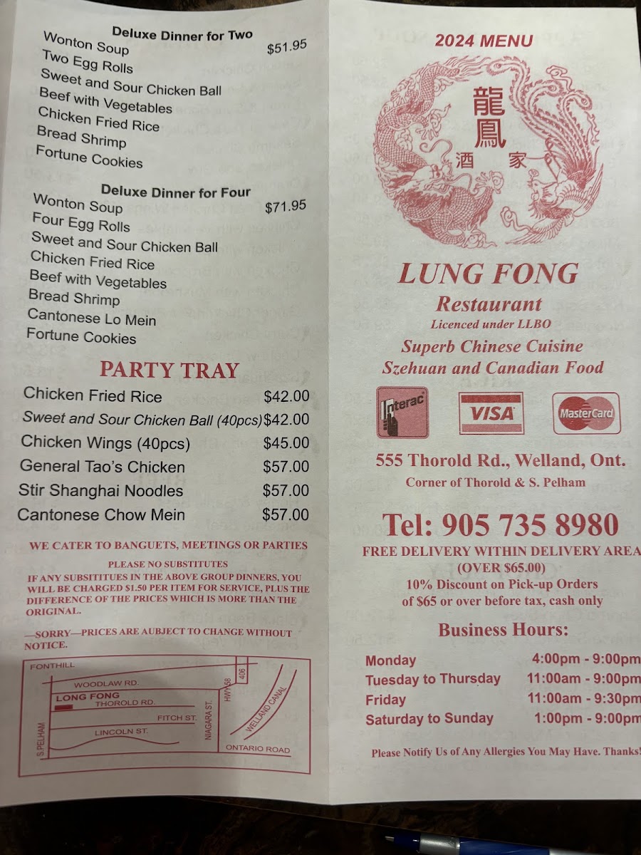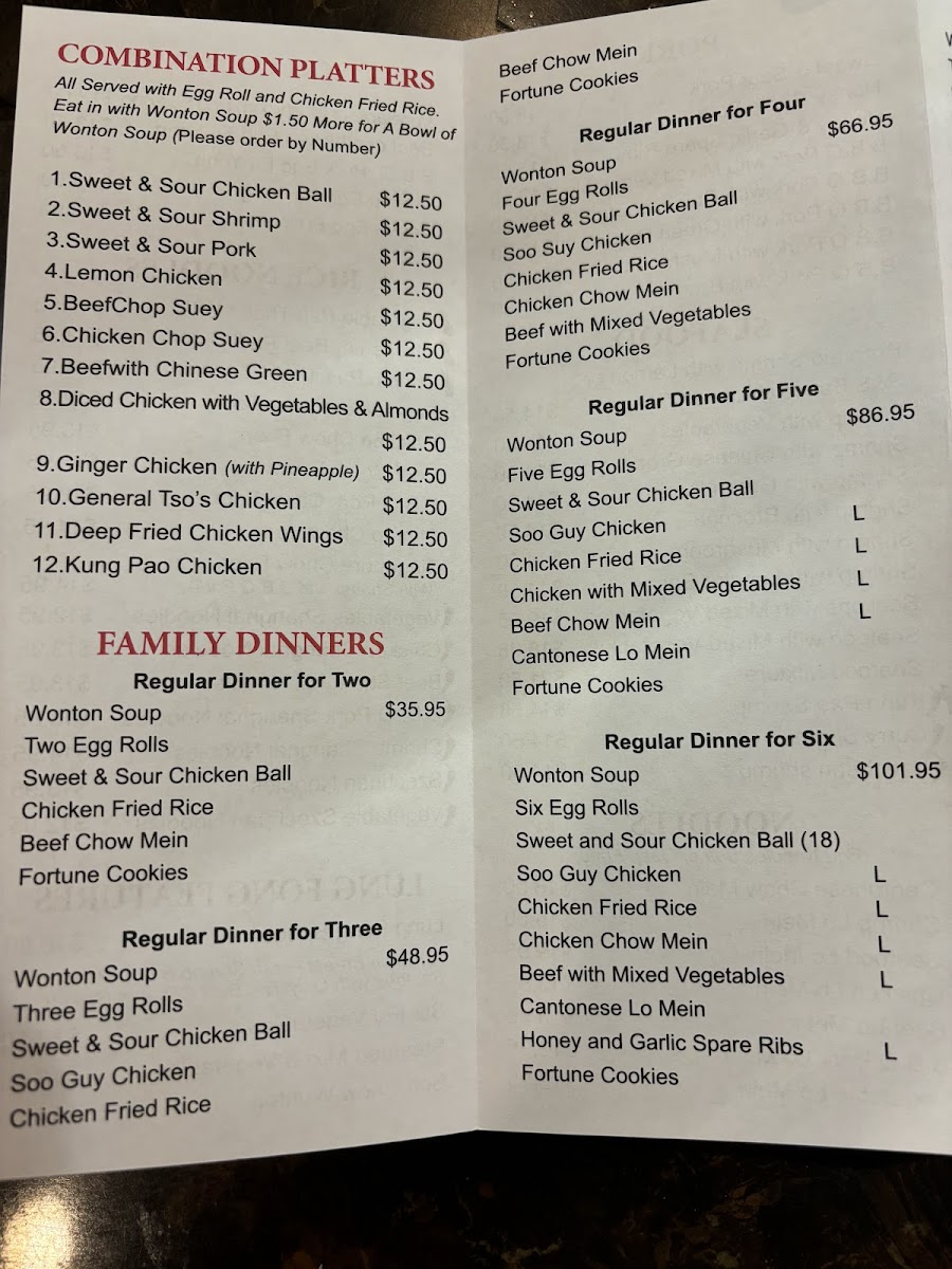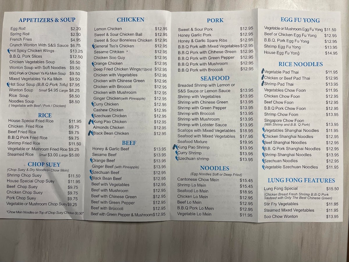 Lung Fong Restaurant, located at 555 Thorold Rd in Welland, ON, offers a diverse and appetizing menu that caters to a variety of tastes, from appetizers to hearty main courses. Starting with the Appetizers & Soup, customers can enjoy crispy Egg Rolls and Spring Rolls, or go for the flavorful French Fries Crunch Wonton with S&S Sauce. For those craving something spicier, the Hot Spicy Chicken Wings are a must-try.