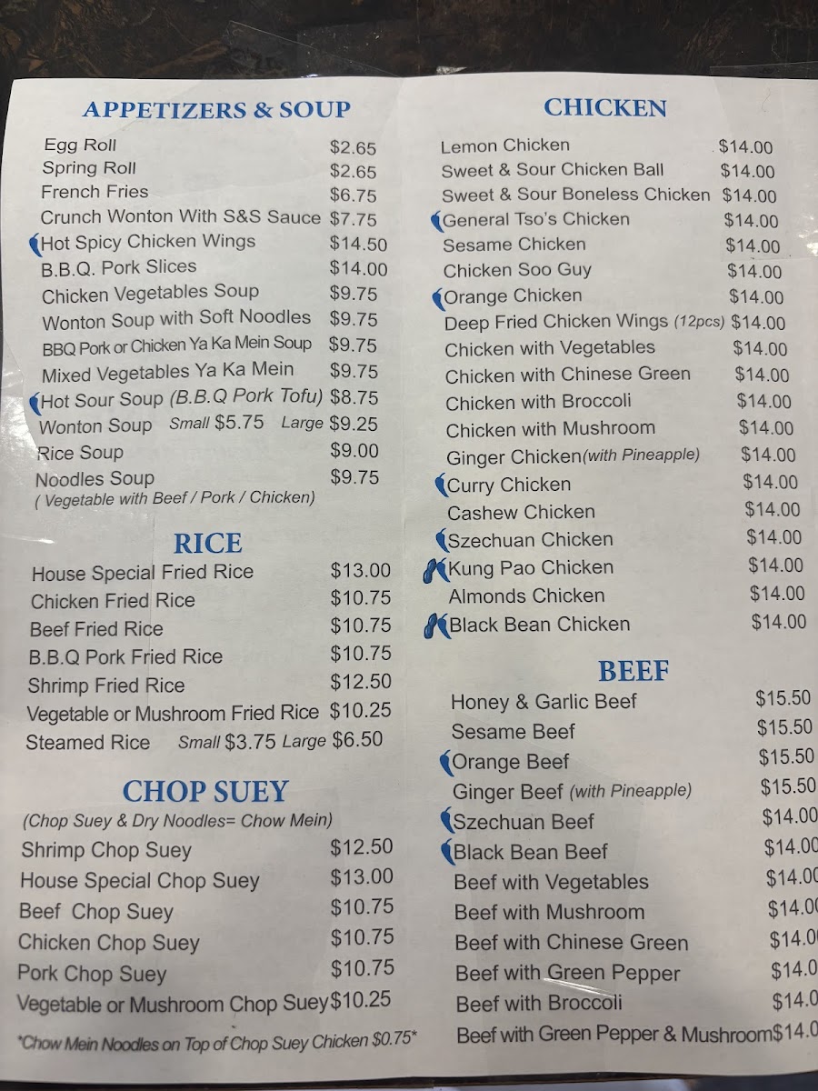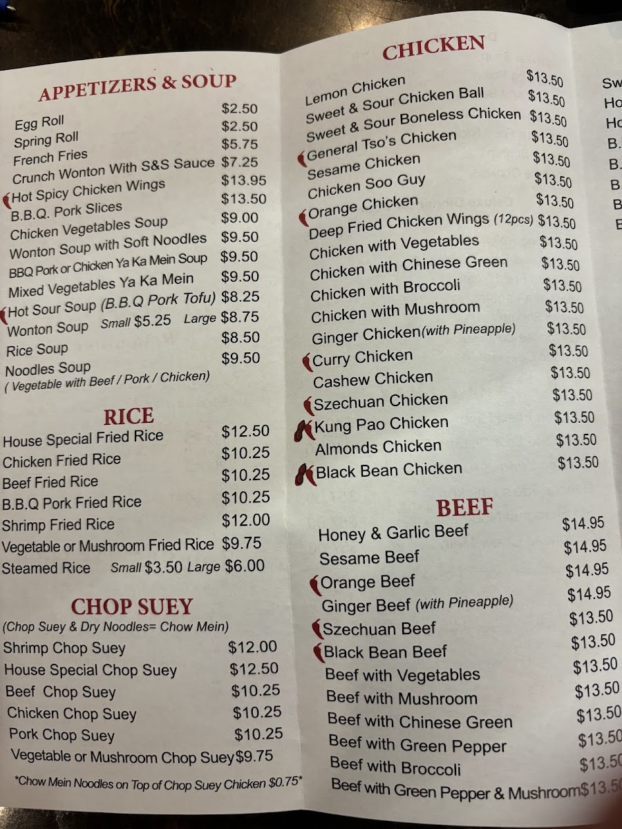 The Chop Suey menu is just as extensive, offering options such as Shrimp Chop Suey, House Special Chop Suey, and Beef Chop Suey, as well as variations like Chicken and Pork Chop Suey.
