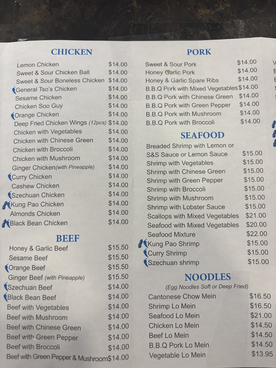 The Chicken section is packed with flavorful options like Lemon Chicken and the ever-popular Sweet & Sour Chicken Ball, each offering a perfect balance of crispy and tangy. General Tso's Chicken and Sesame Chicken are standout dishes for anyone craving a savory, sweet, and slightly spicy kick. If you're looking for a tender yet savory meal, the Sweet & Sour Boneless Chicken is a delicious choice.